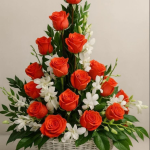 Por otro lado, las flores blancas complementan el arreglo con suavidad, logrando un equilibrio visual agradable. Al mismo tiempo, la canasta blanca añade un toque cálido y natural que resalta cada flor. Debido a esto, este diseño se convierte en un regalo ideal para cumpleaños, aniversarios y momentos donde se desea transmitir admiración auténtica.